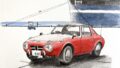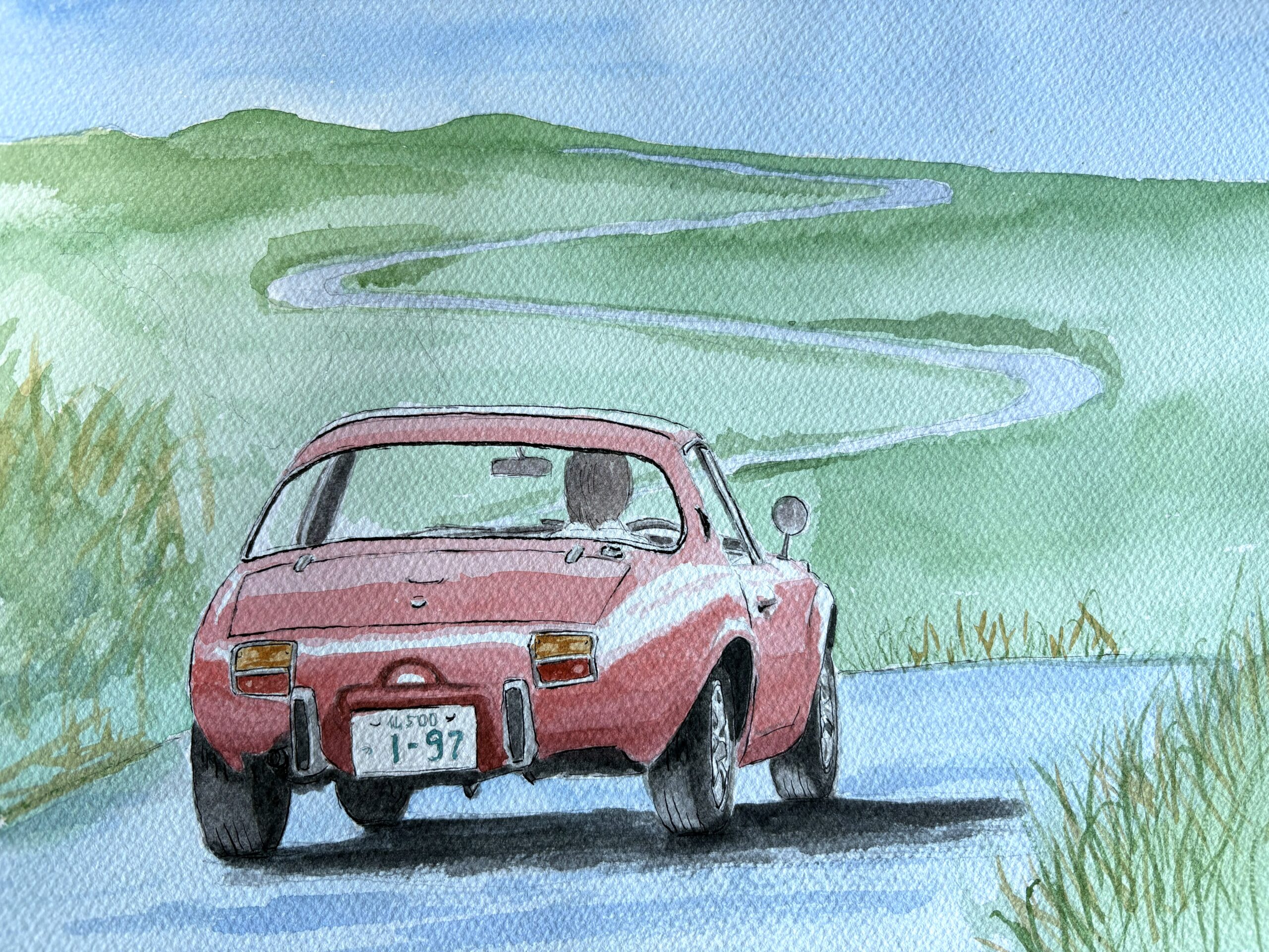 今回の水彩画の主役は、真っ赤なスポーツカー。 曲がりくねった一本道、行く先には何があるのか。そんな冒険心を描き込みました。